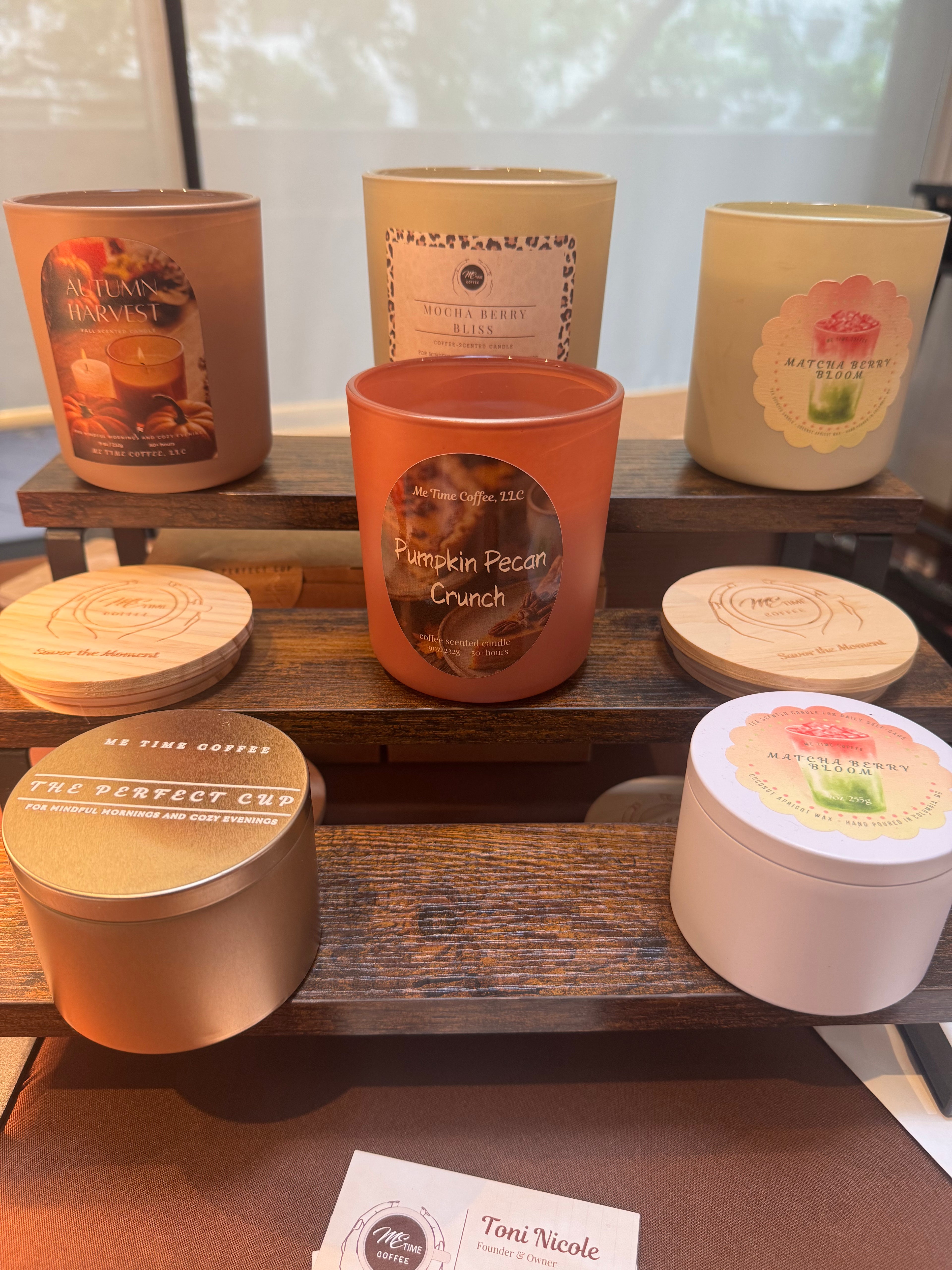 Hand-poured candles by Me Time Coffee, crafted to elevate your self-care routine with mood-boosting scents for intentional self-care.